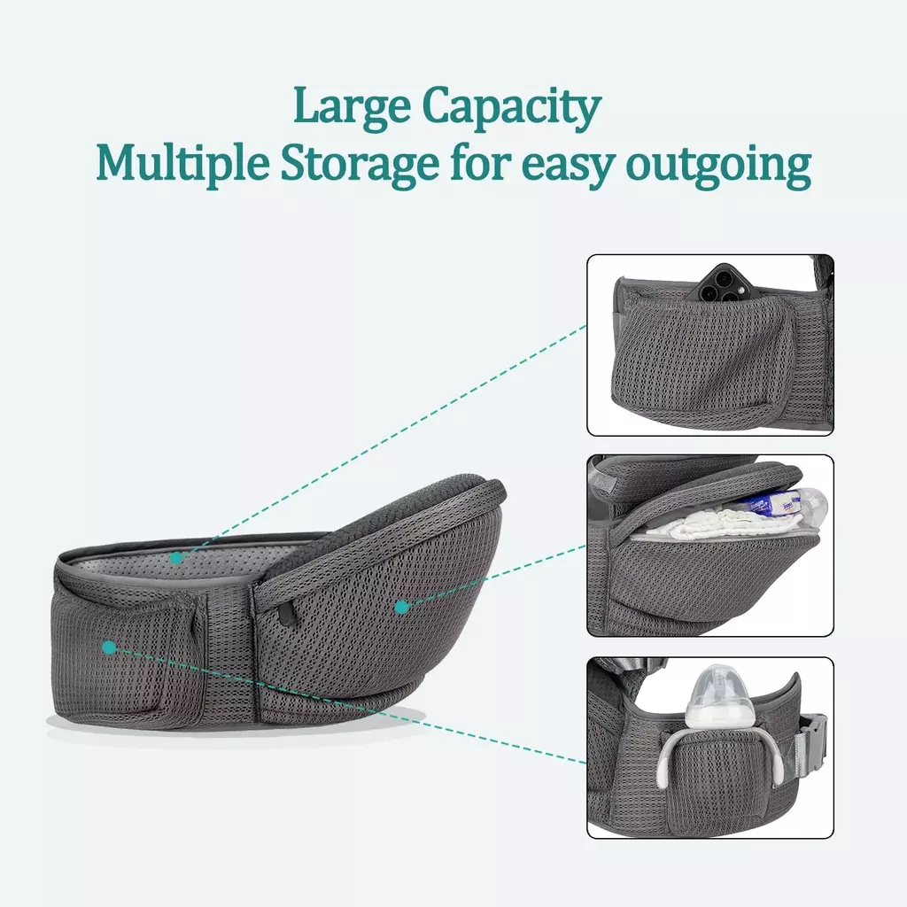 Incluye bolsillo portaobjetos y porta mamadera, ideales para llevar lo esencial sin necesidad de bolso adicional.
